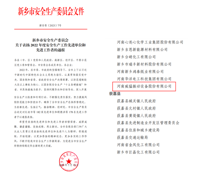SEE MORE2023年7月,河南威猛振動設(shè)備股份有限公司被新鄉(xiāng)市生產(chǎn)委員會授予“2022年度生產(chǎn)工作先進(jìn)單位”榮譽(yù)稱號。此項(xiàng)殊榮,是新鄉(xiāng)市安產(chǎn)委員會對公司工作的高度肯定。公司自成立以來,始終牢...